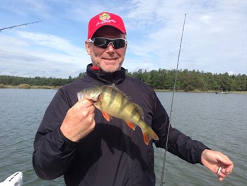 När nappen började avta så flyttade vi oss på nytt. Det var ju ändå abborre vi skulle fiska. På nästa ställe fiskar vi lite djupare. Vi sökte av botten med jiggar på runt 4-5m djup och det nappade på ganska bra och vi drar ett tiotal borrar på en ganska kort tid. Därefter avrundade vi dagen och kunde sumera 40+ antal abborrar och ca 25 gäddor.
