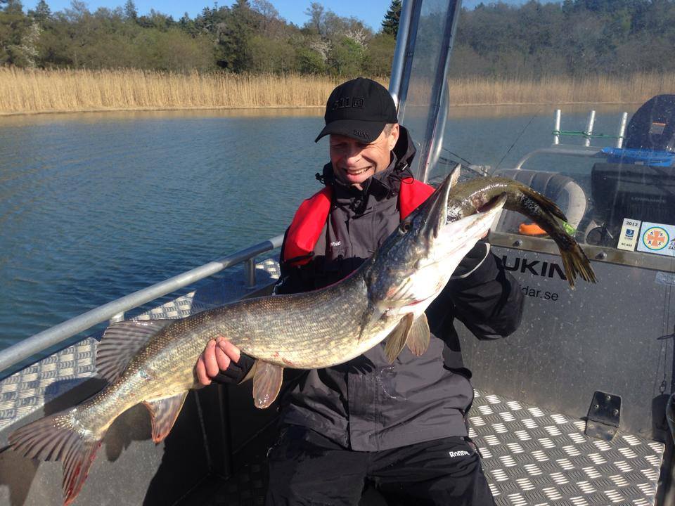 Jag var ut med ett gäng härliga grabbar som bokat ett av mina fiskepaket med boende torsdag-fredag. Torsdagen började okej med 11 fiskar innan lunch. Efter vi ätit pytt-i-panna-delux så blev fisket riktigt segt. Vi avslutar dagen i en liten mar. Jag bränner ganska omedelbart en fin fisk. Någon minut senare får Peter denna fina gäddan på drygt 5 kg.